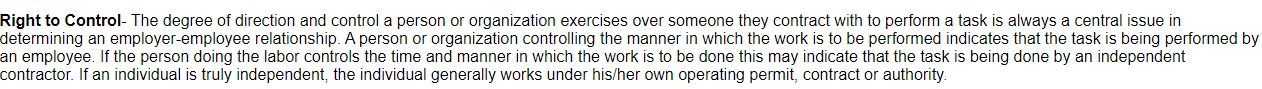 - The right to control. Does the hiring entity or employer control the manner in which the work is done? In stenographic freelance circles, and particularly in New York, this can be a mixed bag. They might ask you to use a specific layout, arrive at a specific time, or even bring snacks to a depo. There are varying degrees of control, and if your agency is exercising a lot of control over you, you just might be an employee.