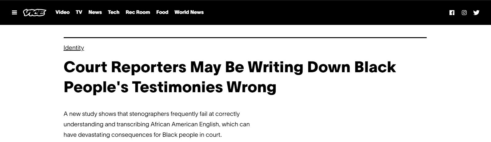 All we are asking for is some fairness in the way our field is reported on in the news. I’ve often joked that advocating for stenographic court reporting is a lot like the children’s story Horton Hears A Who. We’re here but we’re unseen and unheard. We’re in danger of being boiled by big money and tall tales. Those of us that speak up can face a lot of ridicule or be cut short. Take my appearance on VICE News about the Testifying While Black study. Here’s an important topic that deserves headlines, namely, addressing disparate outcomes based on the dialect that someone speaks. I was filmed for about two hours, and Taylor Jones and his people were, as I understand it, filmed close to nine hours. Nobody expected a ten-hour special, but this topic got fifteen minutes. Court reporters took some serious heat in the news because we scored 80 percent accuracy in African American Vernacular English dialect. Every single news source I’ve seen has missed or excluded pilot study 1, where regular people scored 40 percent, and pilot study 2, where lawyers scored 60 percent. VICE cut me talking about the pilot studies and how people who really care about record accuracy need to join our field. You have a story here where court reporters are twice as good as the average person at hearing and transcribing this AAVE dialect that we get no training in, and that got warped into many variations of “court reporters don’t understand black people.” That’s a concept mired in ignorance. The story itself acknowledges not all black people speak AAVE, and yet the headline and lede rips on us despite the fact that we’re the most likely ones in the room to understand AAVE. I cannot imagine such an irresponsible word game. It’s almost like publishing an article with the headline “Journalists May Be Reporting Black People’s Stories Wrong” just because they might ostensibly fit into the category of “regular people.” But I can’t imagine that anyone would ever lump groups of people together and make broad, false headlines just for clicks. Oh, wait —