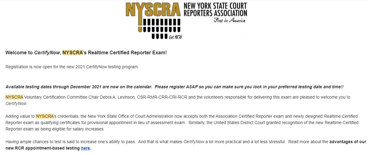 You can also sign up for NYSCRA’s voluntary RCR test pioneered by the founder of DALCO reporting, Debra Levinson, CSR-RMR-CRR-CRI-RCR. Read more below and register here!