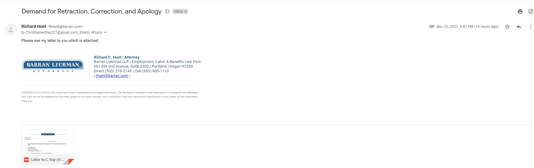 Last night at about 10:00 p.m., I received an e-mail from Richard Hunt of Barran Liebman LLP about Naegeli. It was a fairly standard legal threat, not that I know what those look like, since I’ve never received one before. If you’re short on time, skip their nonsense and read my reply.