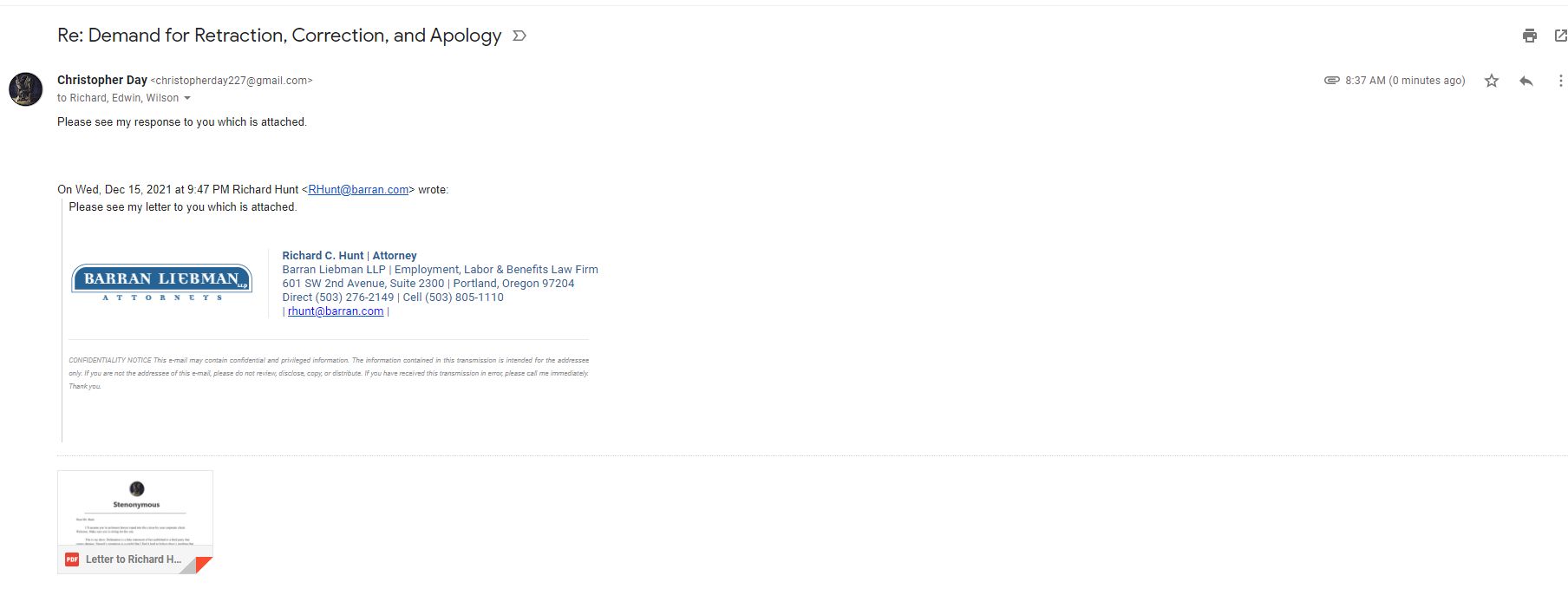 My field is beset by silence and fear. I aim to break this. To achieve this I have become a goal-oriented person. You see, now that Naegeli has threatened to sue through an actual law firm, it’s put itself in a much worse position than anyone could have conceived. Now Naegeli has two choices. It can fail to sue me, and show an entire field of nearly 30,000 court reporters that it is a scared barking dog, which will embolden them. The competition from all of them will become so fierce that it will run the company into the ground. Alternatively, Naegeli could sue. I am quite sure that I can find a valid counterclaim. We can lock each other in for a lawsuit and give this field the show it never knew it needed. It will be the single-largest destruction of capital the industry has ever seen and your client’s reputation will drop even more as court reporters across the nation realize that money could’ve gone into advertising to fix the stenographer shortage. Imagine the backlash. “Yes, I could’ve spent $400 an hour advertising this profession but instead I, Naegeli & Co., have decided the money is better spent stifling Christopher Day’s free speech.”