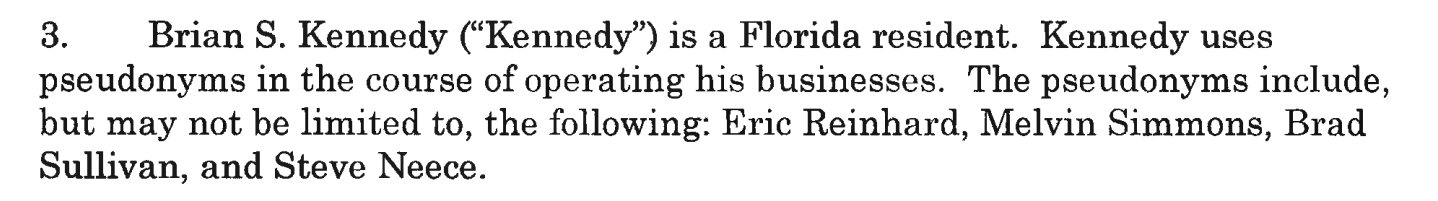 The quick version is that Cengage, d/b/a Ed 2 Go, a/k/a the people that were apparently working with BlueLedge to draw people into digital court reporting in a way that I found dishonest and arguably defamatory, was working with a man named Brian Kennedy according to this Colorado Attorney General’s complaint. It starts off really well. The man uses like four different pseudonyms for his business dealings. Allegedly.