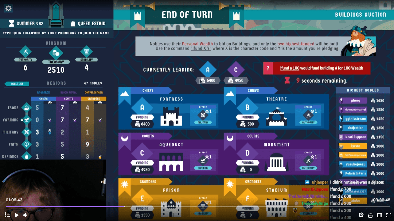 At some point in the game, you will be presented with the option to purchase buildings for the territories. These buildings change the stats of the kingdom. At this point, you’ll be able to vote for what building to buy using your wealth. Instead of !vote, you will use !fund. For example, !fund c 300 will take 300 of your money and put it toward choice C, the aqueduct, which will raise farming of the Counts of the East.