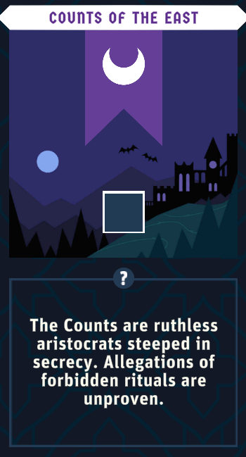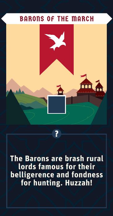 Close to the start of the game, each territory will choose a scheme to place their claimant on the throne. In the picture above, it shows that the Counts have reached their scheme objective for farming and will be able to advance their scheme. This is juxtaposed against the Chiefs, who need to raise their military. As you might imagine, the buildings can help sabotage or support schemes.