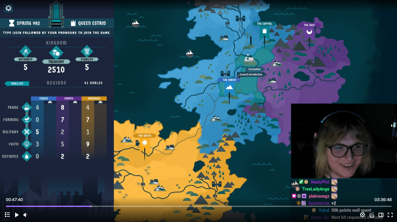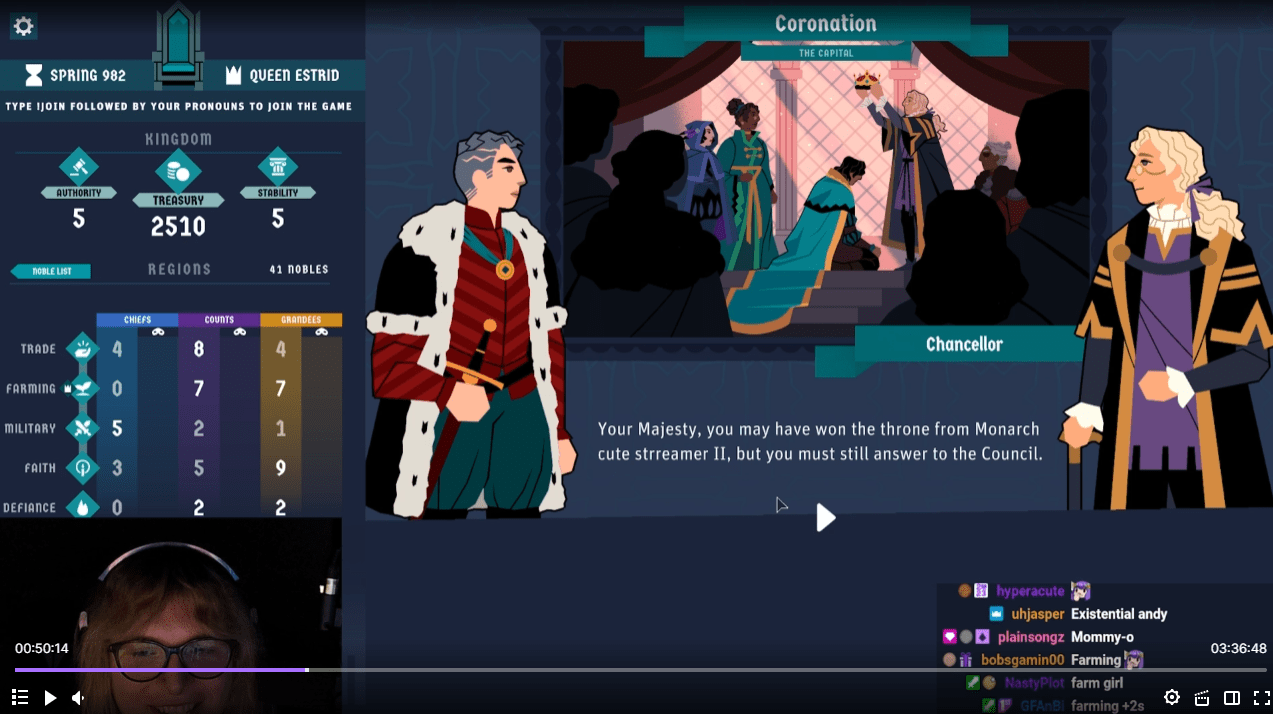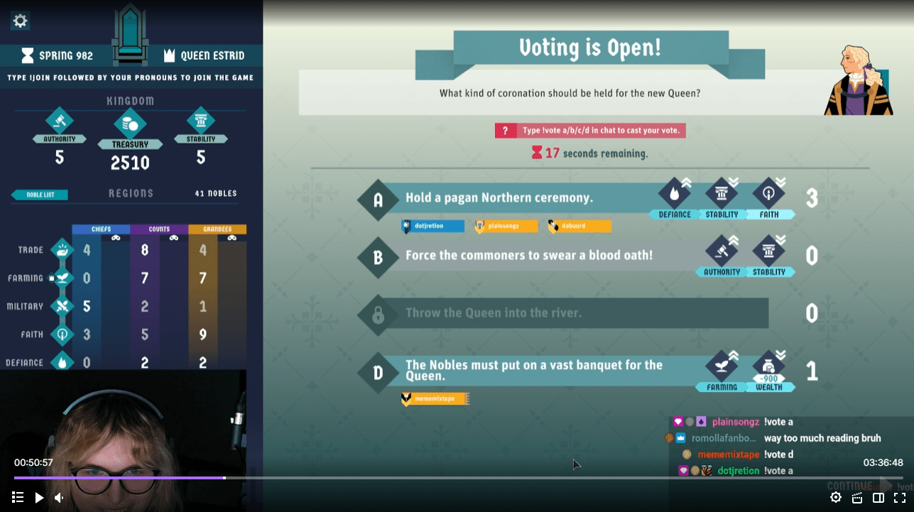 That’s pretty much it. I’ll be talking you through it every step of the way. As long as you can remember !join, !vote, and !fund, you can play this game. Just let me know when Twitch interrupts your game with commercials in the chat box so that you don’t miss out on game time.