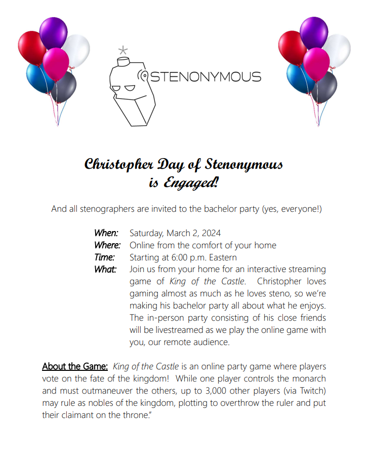 NOTE: Anyone may join. We will not be checking stenographer cards at the door. This can be played on your computer via the Twitch website or on your phone via the Twitch app.