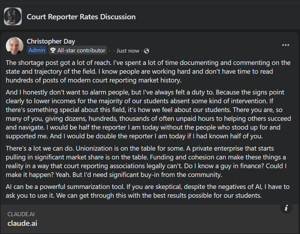 Christopher Day addresses Court Reporter Rates Discussion Facebook Page after 20k reach post about there being no shortage.