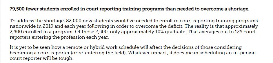 Court reporters, I stand on the backs of all of you at this point. Without your hard work I wouldn’t have been in a position to publish this story. But if we don’t get it in front of people, this is for nothing. I have made about $400 in donations these past two weeks and I will sacrifice every dime of it to boost this post. If you can afford a donation, please send $20. If you cannot, please consider sending this to lawyers and/or tagging a local bar association on the Facebook and Twitter campaign. They cannot be expected to be experts in our industry. We must guide them. Every state is important, but California, Texas, Illinois, and New York are where the majority of our business is, and where the shortage lies can hurt us most. This is not new. This is something we felt in 2019 and now have much more concrete evidence of.